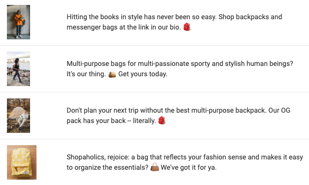 Ranked 5th overall in KPI Revenue, and #1 in Impressions and Likes, in Rutgers Business School's class of 28 grad students. Targeted 7 buyer personas over Q4 across Facebook, Instagram, YouTube, Twitter, Pinterest and TikTok for a diverse bag brand modeled after Herschel Supply. Wrote copy, selected creative and scheduled this Social Media Marketing Strategy with Organic, Paid, and Influencer components, using a platform similar to Hootsuite (Stukent's Simternship).